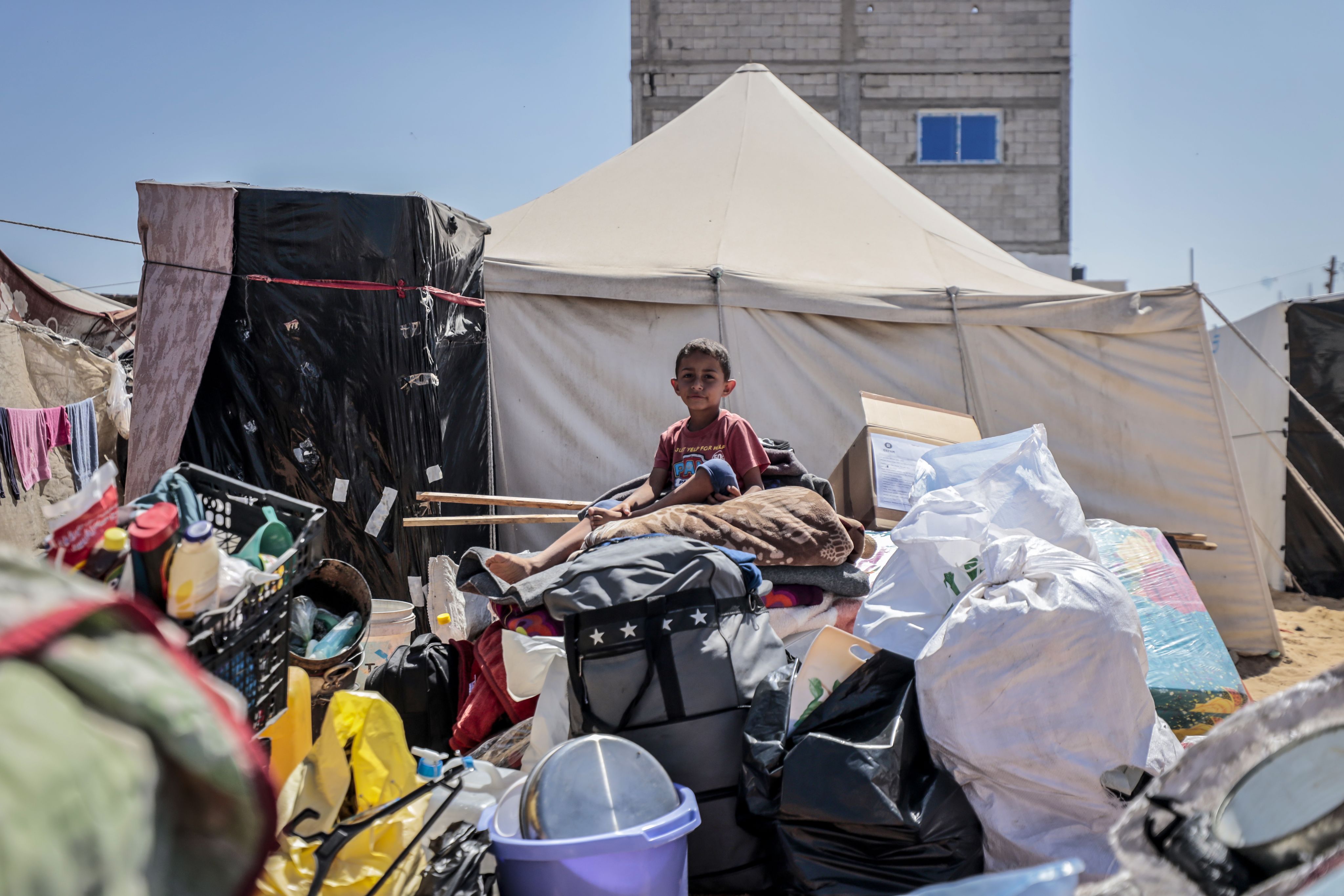 A boy sits atop a pile of belongings and supplies in Rafah, Gaza Strip. The ongoing conflict in Gaza has left over 2 million people living in internal displacement by mid-October 2024. © NRC/Amjad Al Fayoumi