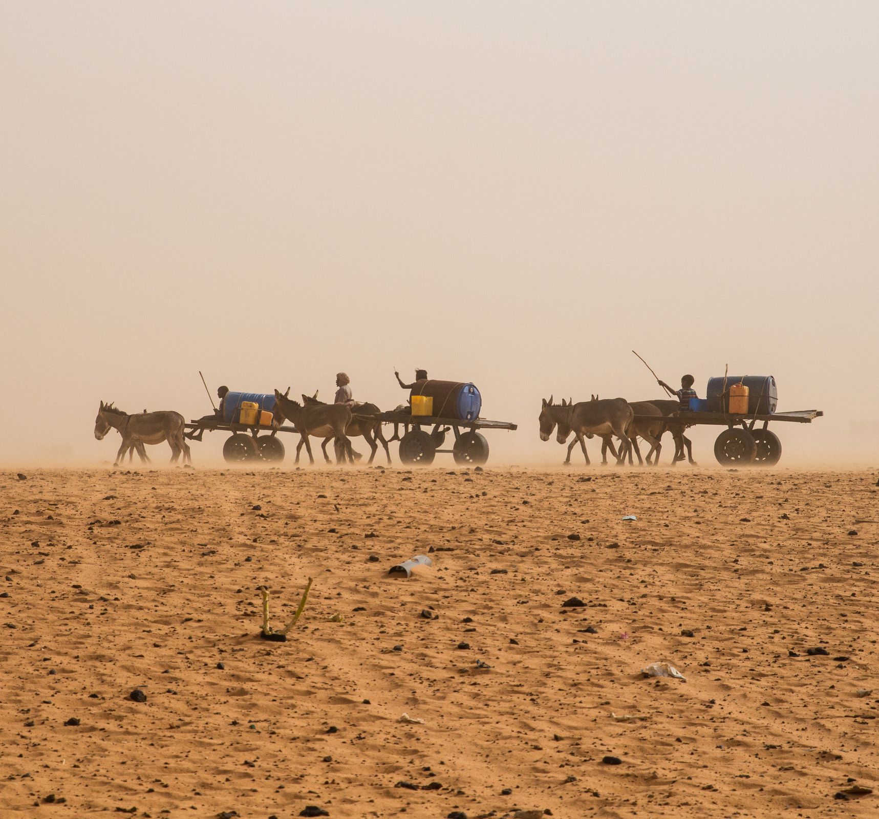 Background image: A small caravan of donkeys carrying water cans through a sandstorm during a major drought in Mauritania. © IOM/Sibylle Desjardins