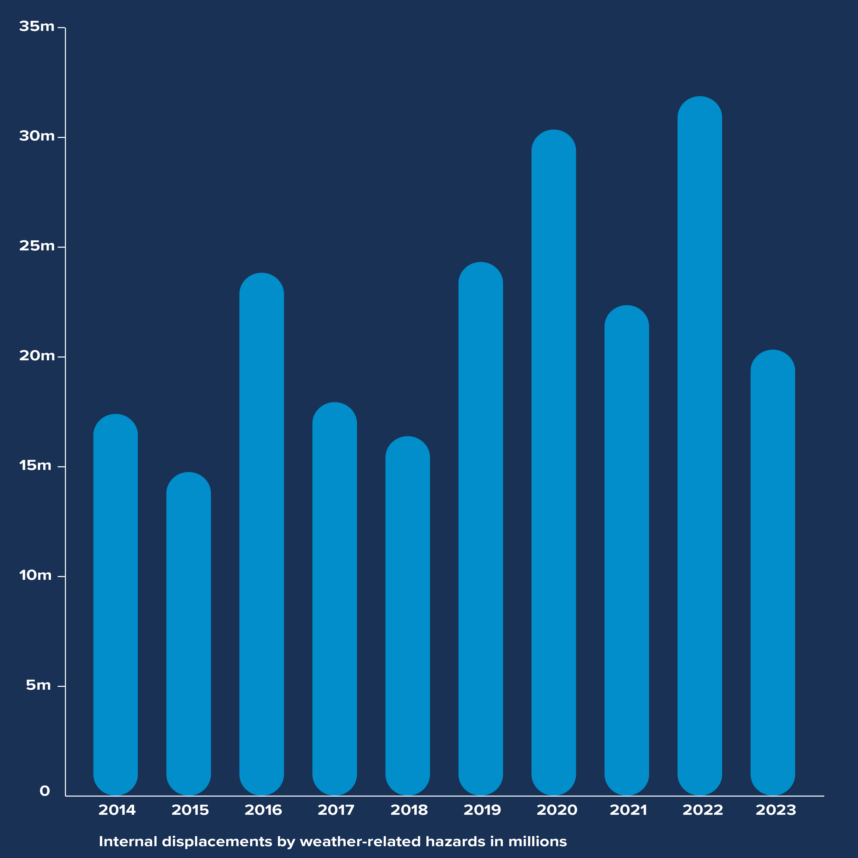 Climate change is making extreme weather events that trigger displacement more frequent and more intense. At the end of 2023, 6.6 million people were living in internal displacement due to weather-related disasters, and without action, that number is sure to rise.
