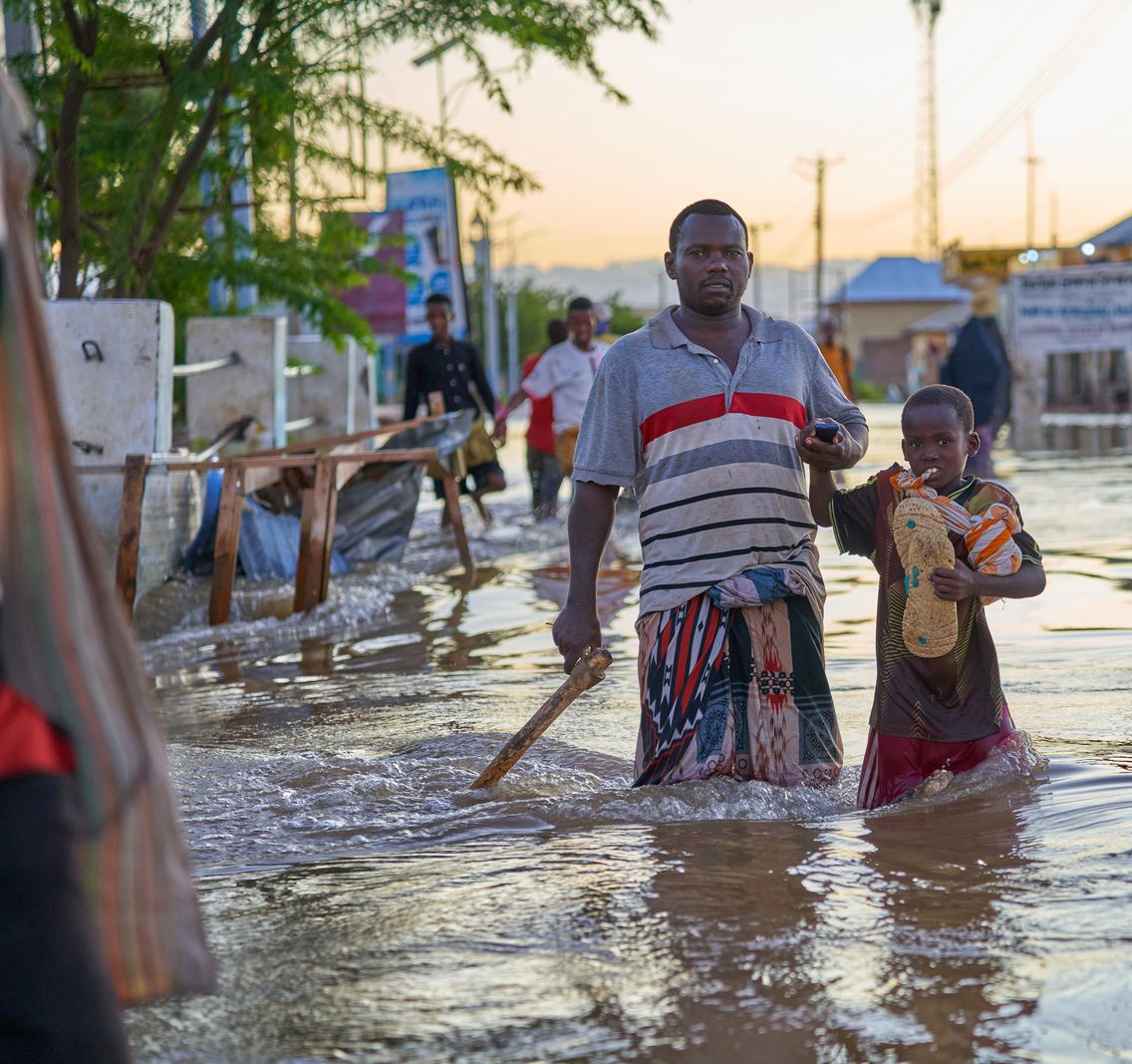 Background image: A man and boy wade through floodwaters in Beledweyne, Hirshabelle State, Somalia, after the Shabelle River broke its banks in May 2023. © IOM 2023/Claudia Rosel