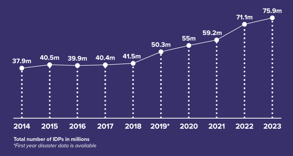 The total number of people living in internal displacement increased by 51% over the past five years, reaching a record high of 75.9 million people across 116 countries at the end of 2023. © IDMC