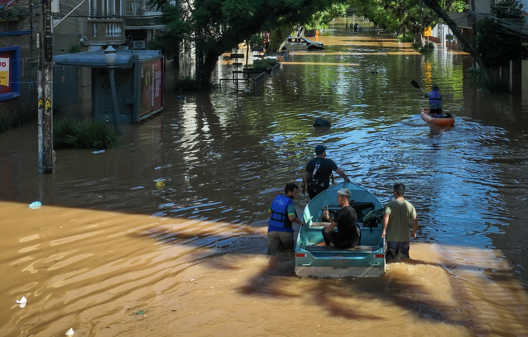 Background image: A group of rescue workers navigate a flooded street to evacuate residents in Porto Alegre, Brazil. Widespread flooding caused by heavy rains triggered around 775,000 internal displacements, making it the country’s largest disaster displacement event. © Jefferson Bernardes/Getty Images